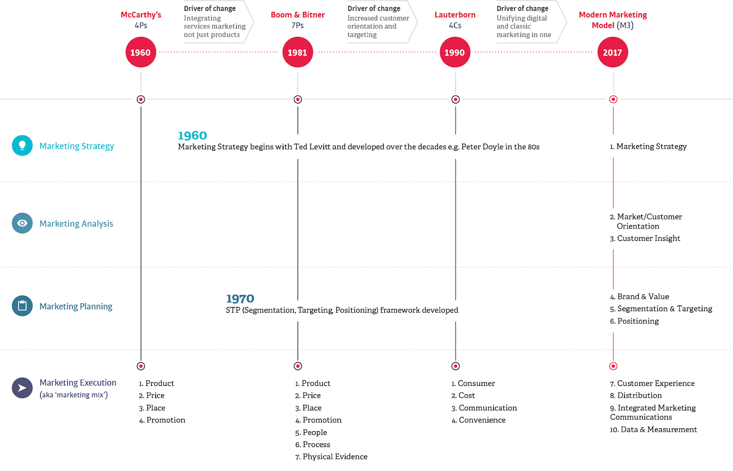 The diagrams below outline how popular marketing models have evolved over the last 60 years, culminating in the 10 elements of the Modern Marketing Model (M3) which we then show broken down into four stages: strategy, analysis, planning, execution.