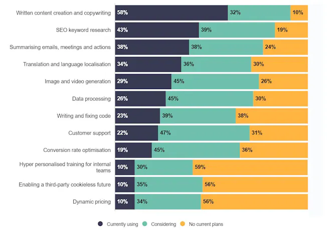 Looking at responses to Econsultancy’s Future of Marketing survey (figure 1), those manual and time-consuming jobs feature highly as use cases for AI. Over three quarters are considering or actively using the technology to summarise emails and meetings, for example, and a whopping 90% are using or considering GenAI for content creation or copywriting.