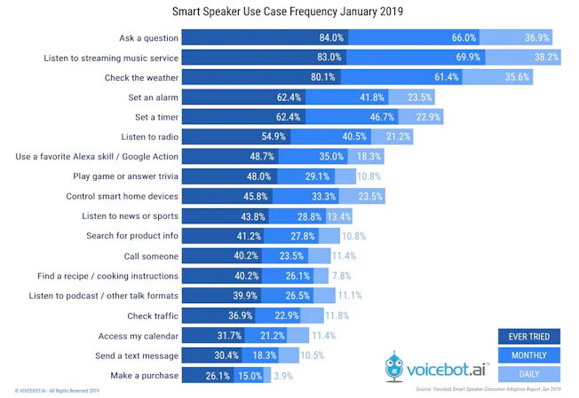 What about smart speakers, those great agents of the voice-first revolution? According to the most recent figures from Voicebot’s Smart Speaker Consumer Adoption Report 2019, 84% of smart speaker owners have tried using their device to ask a question at some point, but only 37% use this functionality daily. The percentage is even lower for product info searches (the kind most potentially valuable to brands, since again, not all queries can be ranked for), which only 41% of smart speaker owners have ever conducted, and just 11% carry out daily.