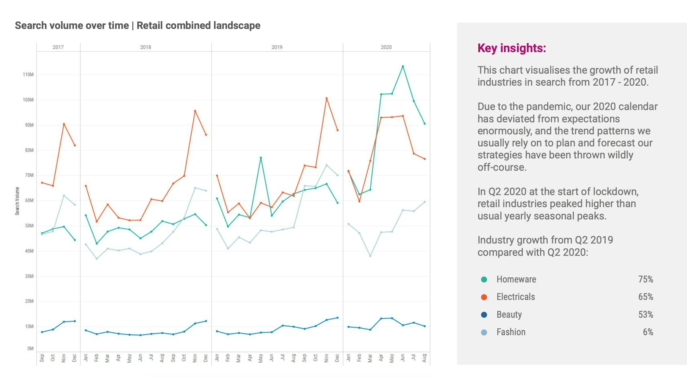 Search volume trends in various verticals from 2017 to 2020, charted by Pi Datametrics, illustrate the phenomenal growth that took place in 2020. (Image: Pi Datametrics)