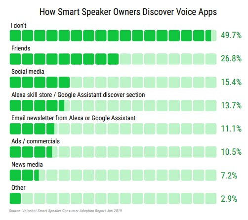 Voicebot’s Smart Speaker Consumer Adoption Report 2019 surveyed US smart speaker owners on how they discover voice apps, and found that almost half of consumers – 49.7% – simply don’t. What’s more, this percentage is on the increase: when Voicebot asked consumers the same question for their 2018 report, 48.2% of consumers said that they don’t discover voice apps.