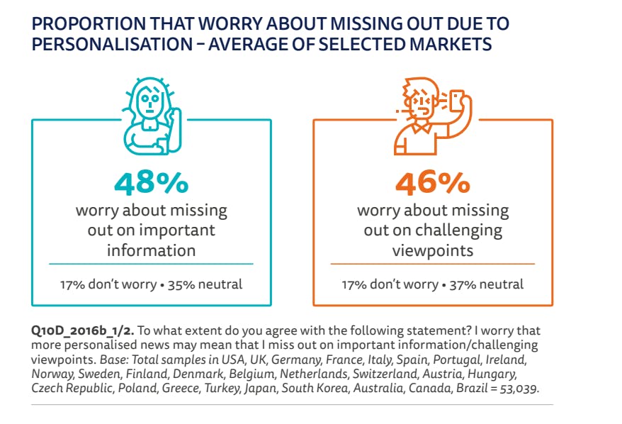 The proportion of users that worry about missing out on important info due to personalisation. Source: Reuters Institute