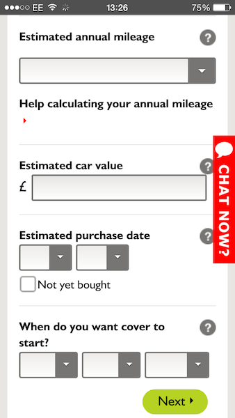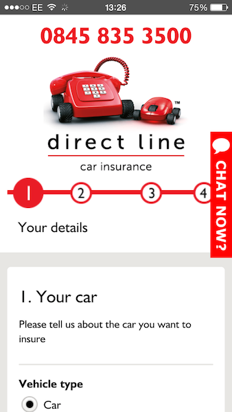 Direct Line’s live chat is clearly available throughout the journey, appearing as a bright green hovering tab.