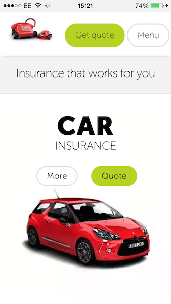 The ‘get quote’ button takes you directly to the car insurance page. Car insurance is given primary place here, as it is the main area that is mobile optimised, other products are accessible by swiping down.